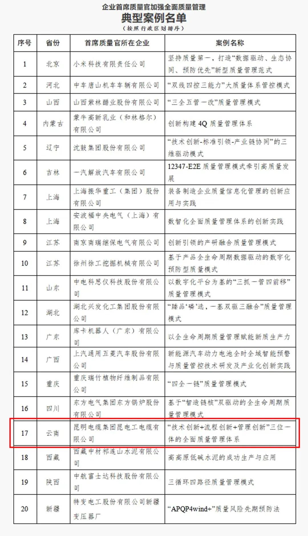 在市場監管總局質量發展局指導下,中國標準出版社組織對各省(區、市)及新疆生產建設兵團市場監管部門審核推薦的218個案例進行了評審,昆明電纜集團昆電工電纜有限公司——“技術創新+流程創新+管理創新”三位一體的全面質量管理體系案例成功入選典型案例前二十。